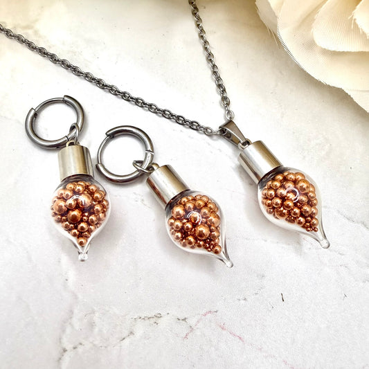 7th Wedding Anniversary Pendant – Glass Drop Filled with Copper Balls | Romantic Copper Necklace