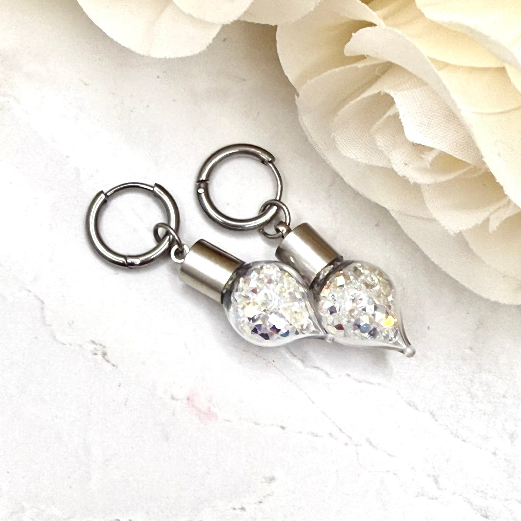 These luxurious 15th Anniversary Huggie Earrings sparkle with genuine Primero AB crystals, radiating a soft spectrum of colour that captures the light of enduring love. The delicate glass droplets are suspended from polished stainless steel hoops, creating a refined and romantic look for day or evening.