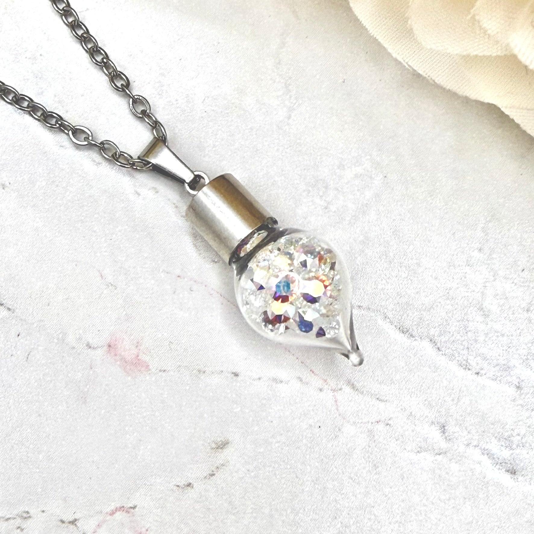 Mark 15 years of shimmering devotion with this breathtaking Pendant Necklace, filled with genuine Primero AB crystals that radiate iridescent brilliance. Each droplet captures the light of love—shifting shades of violet, gold, and blue—symbolising the ever-changing yet constant beauty of your marriage.
