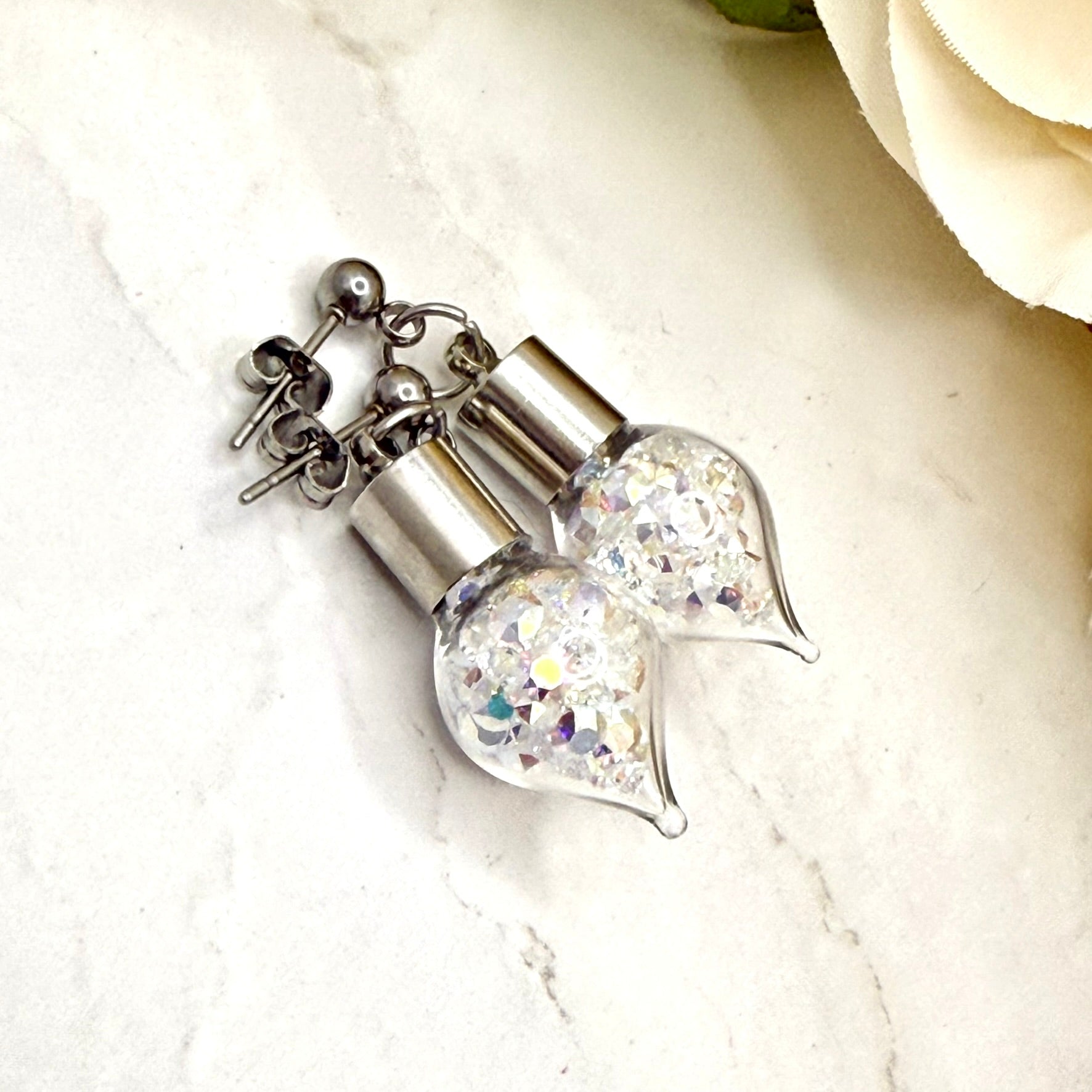 Encased in smooth glass and polished stainless steel, these earrings capture delicate light play and subtle colour transitions, making them a modern yet timeless treasure.
