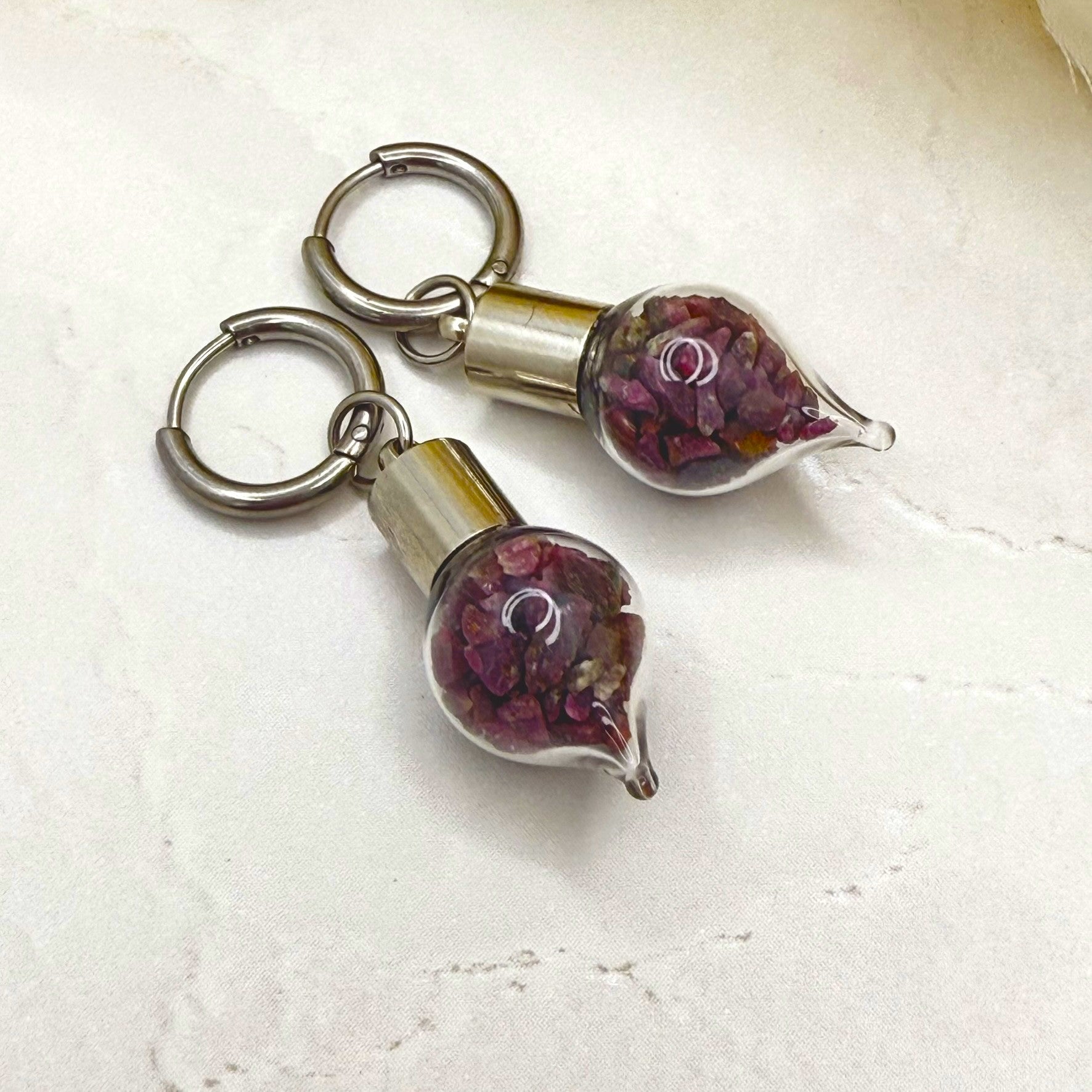 • Glass vials filled with natural raw ruby chips – symbolising passion, energy, and everlasting love