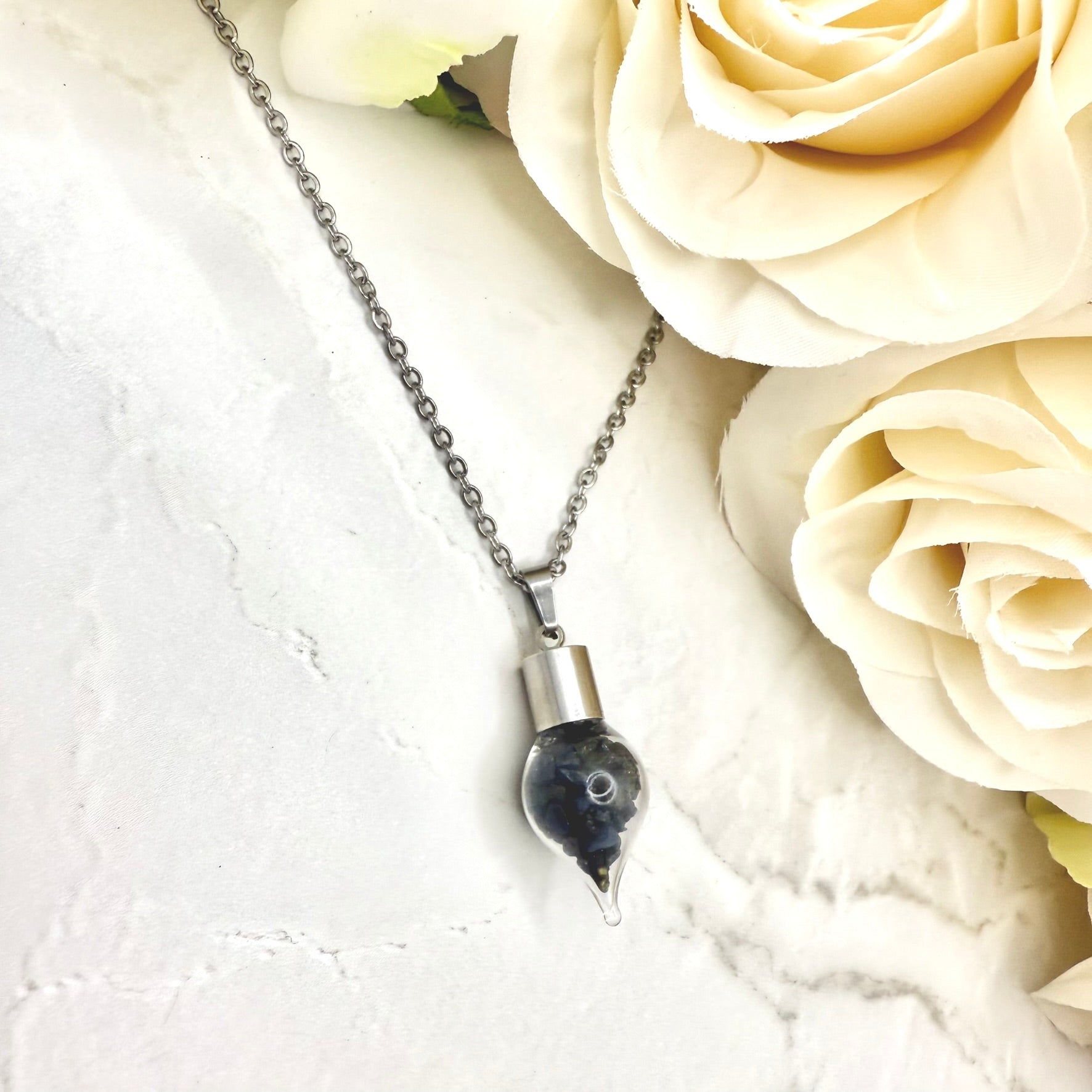 • Glass drop pendant filled with real sapphire shards – symbolising loyalty and eternal love