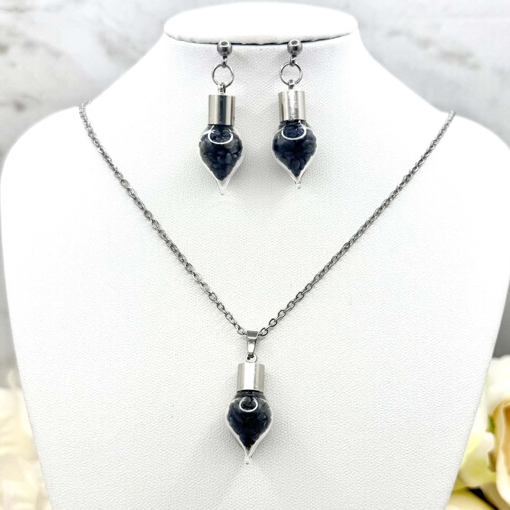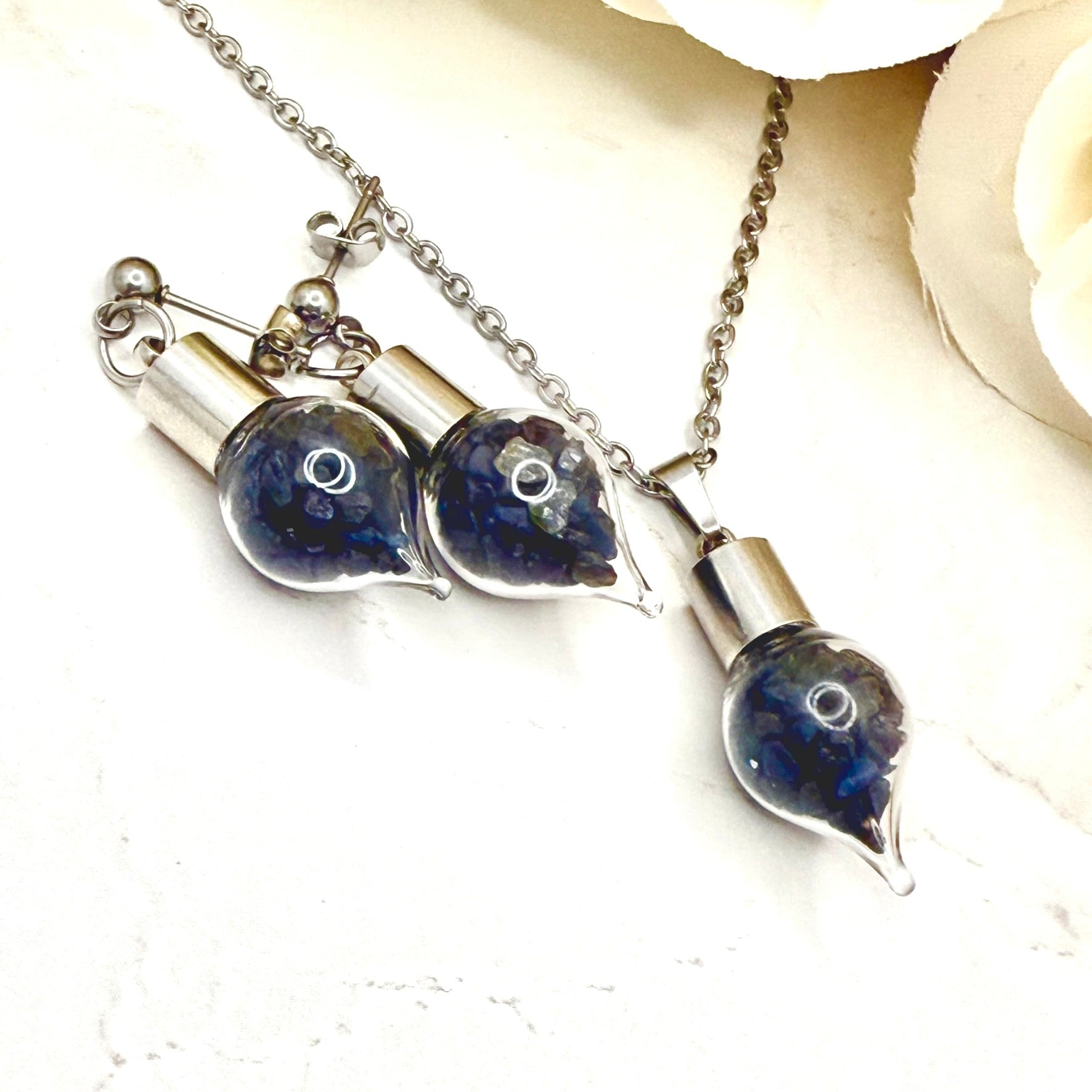 Celebrate the elegance of 45 years of devotion with this stunning Sapphire Anniversary Jewellery Set, available with your choice of stud or huggie earrings. Each piece features a crystal-clear glass drop filled with genuine sapphire shards, radiating deep blue brilliance and symbolising faithfulness, wisdom, and eternal love.
