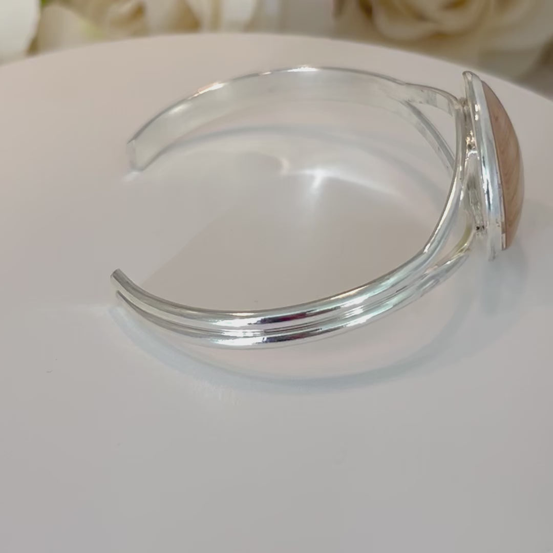 This beautiful bangle features genuine red oak set behind a glass cabochon. Set in a silver plated hinged bangle.